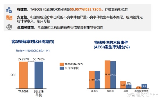 公司核心产品TAB008与罗氏的贝伐珠单抗进行了头对头的临床试验, TAB008和原研药贝伐单抗的ORR分别是55.957%和55.720%,在疗效、安全性上公司与原研药基本类似。该产品有望在2021年下半年上市。