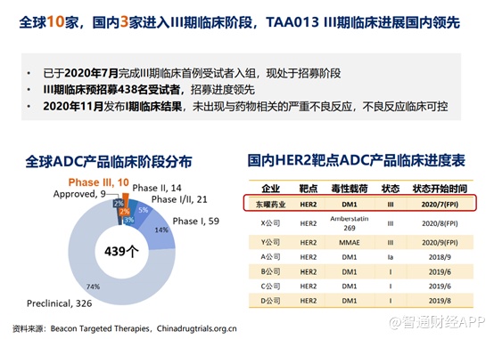 目前国内有三家TAA013的ADC进入三期临床试验,公司在HER2靶点的以DMI为主的临床进展处于领先状态。