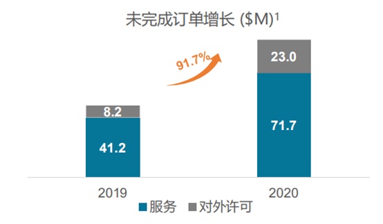 由于金斯瑞在跨膜靶向技术、双特异性单域抗体开发等方面独辟蹊径,市占率亦已在行业内取得领先地位,未来更有望凭借抗体平台的优势获得更大的突破。从未完成订单来看,2020年公司未完成订单达到了9470万美元,大幅增长超90%,将在未来1-2年内转化为实质上的业绩提振。