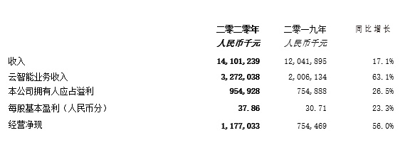 2020年,本公司业务实现逆势增长,收入同比增长达到17.1%,云智能业务收入同比增长达到63.1%,本公司拥有人应占溢利同比增长26.5%,每股基本盈利同比增长23.3%,经营净现同比增长56.0%。