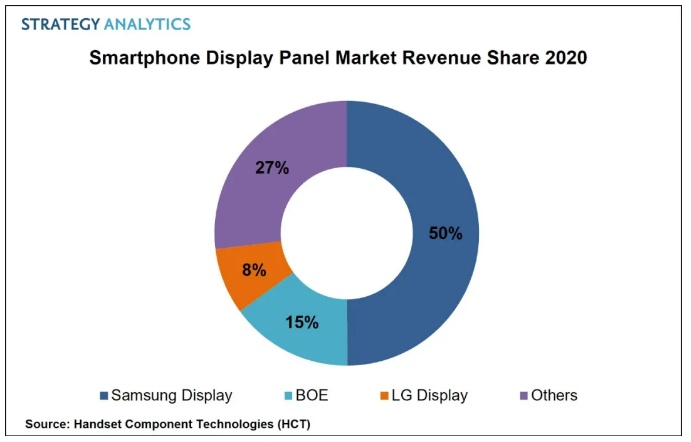 Strategy Analytics发现,2020年,Samsung Display以50%的收益份额领跑智能手机显示面板市场,其次是京东方(15%)和LG Display(LPL.US)(8%)。2020年,智能手机显示面板收益同比增长7%,主要智能手机厂商供应链中OLED显示技术的扩展驱动OLED面板出货量增加。2020年,前三名显示面板供应商在全球智能手机显示面板市场占据了近73%的收益份额。