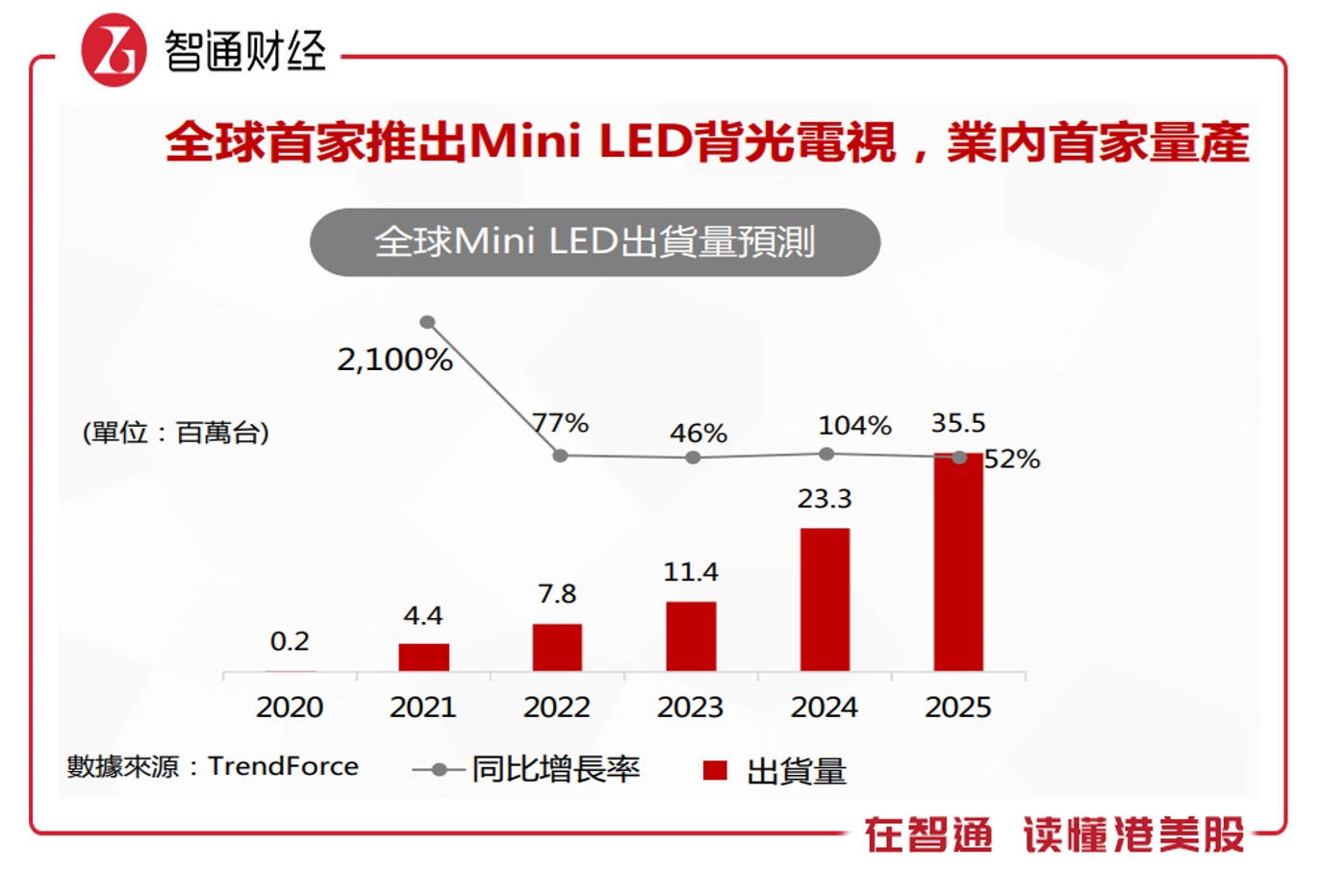 2020年,该公司研发费用16.3亿港元,同比大增117%,研发费用率3.2%,同比提升1.1个百分点。该公司加大产品研发,为用户带来更优质的体验,2020年8月,发布全球首款5G+8K智屏新品,8K Mini LED智屏75X105G版和8K QLED智屏85X9 5G版,根据TrendForce预计,2025年Mini LED出货量将达到3550万台,前景非常可观。