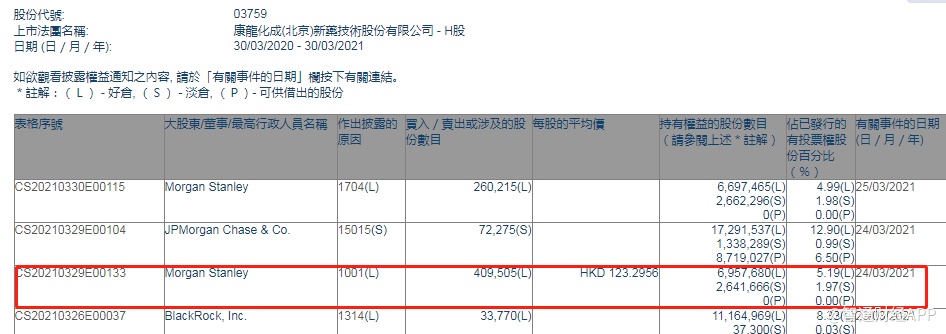 智通财经APP获悉,香港联交所最新资料显示,3月24日,摩根士丹利增持康龙化成(03759)约40.95万股,每股作价123.2956港元,总金额约为5048.95万港元。增持后最新持股数目约为695.77万股,最新持股比例为5.19%。