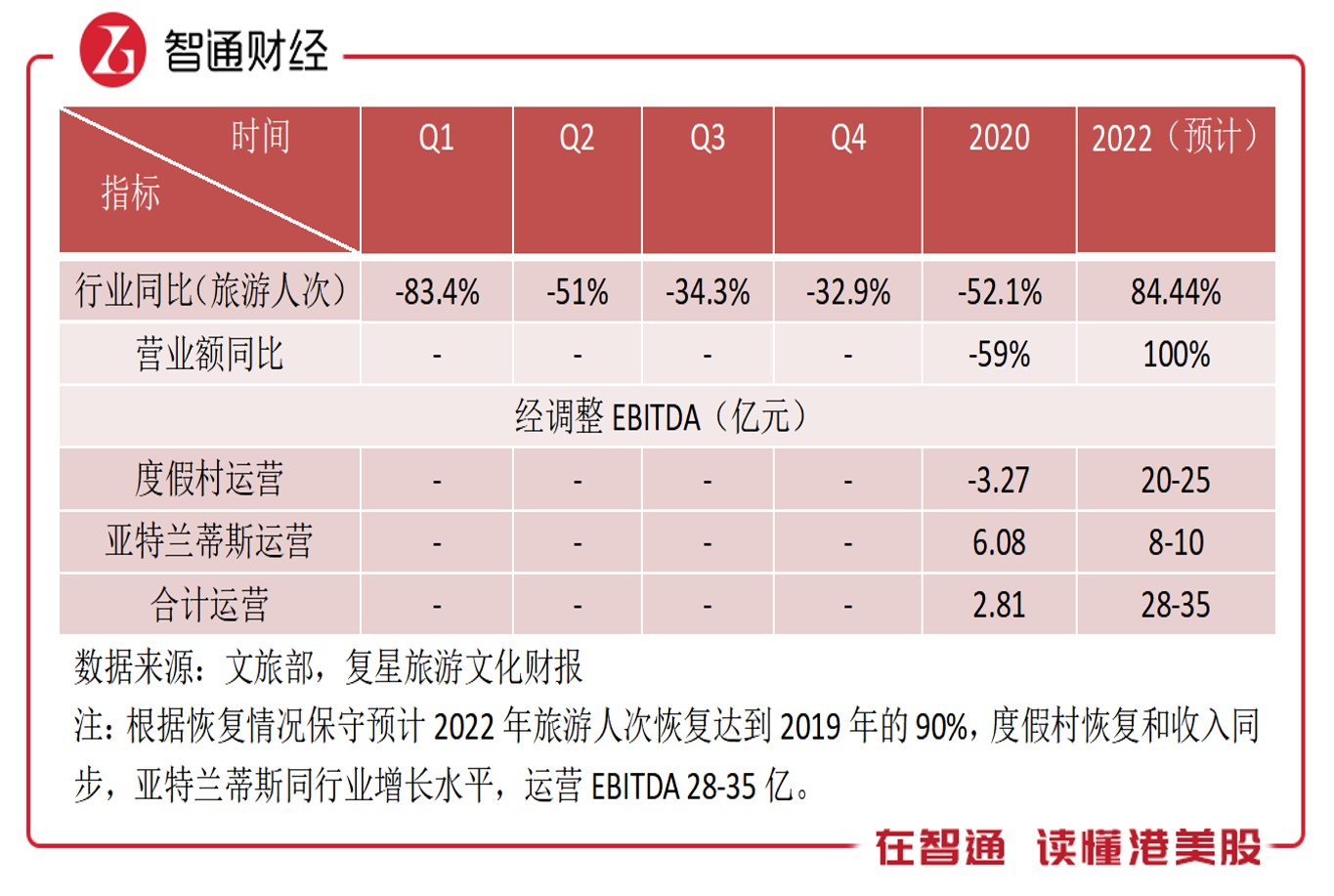 根据目前行业复苏情况,预计2022年行业旅游人次将整体恢复至2019年的90%,复星旅游文化预计2022年收入将较2020年增长100%,若度假村运营EBITDA同步行业恢复水平,及旅游目的地业务保持增长,整体运营EBITDA 在28-35亿,而目前市值/EBITDA为3.4-4.2倍,明显被低估。