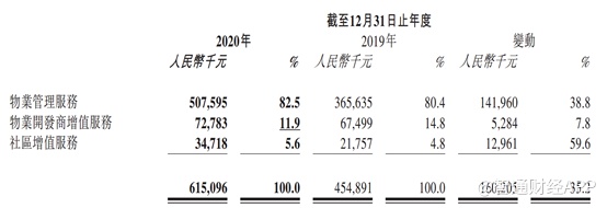 佳源服务的收入来自三个业务分部,即物业管理服务、物业开发商增值服务、社区增值服务。2020年,来自三个分部的收入占比分别为82.5%、11.9%和5.6%。