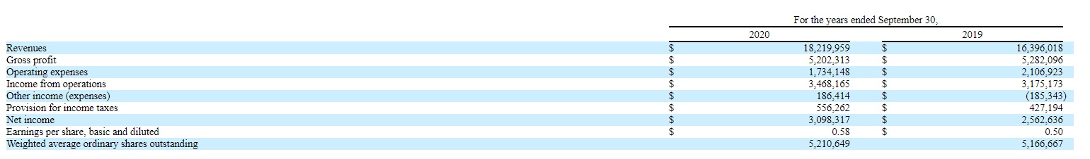 财务方面,截至2020年9月30日的2020财年,公司营收为1822万美元,同比增长11%;毛利为520万美元,同比下降2%;净利润为310万美元,同比增长21%;每股收益为0.58美元,上年同期每股收益为0.5美元。