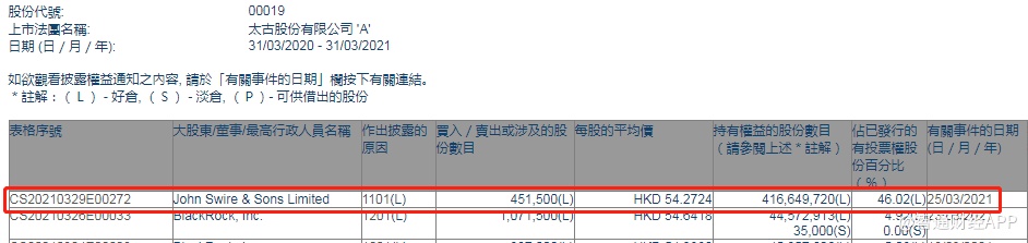 智通财经APP获悉,香港联交所最新资料显示,3月25日,John Swire & Sons Limited增持太古股份公司A(00019)45.15万股,每股作价54.2724港元,总金额约为2450.40万港元。增持后最新持股数目约为4.17亿股,最新持股比例为46.02%。