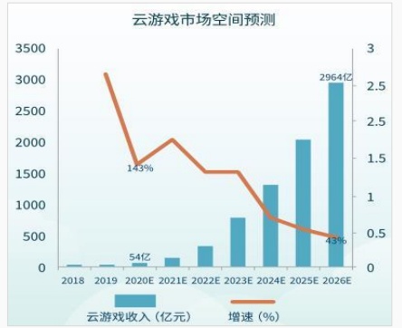 2019年,中国游戏市场规模为2330亿元,其中云游戏市场规模仅有22亿元。随着5G网络全面普及,云游戏的渗透率将达到50%,预计到2026年,中国云游戏市场的规模届时将接近3000亿元。