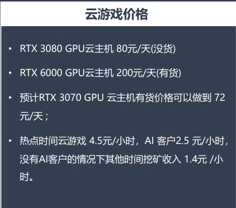 GPU云主机集群并非只为云游戏和云办公而生。更关键的是,不同功能之间可以迅速切块:它可以在热点时间用于云游戏,空闲时间用于云渲染、云挖矿以及其他。