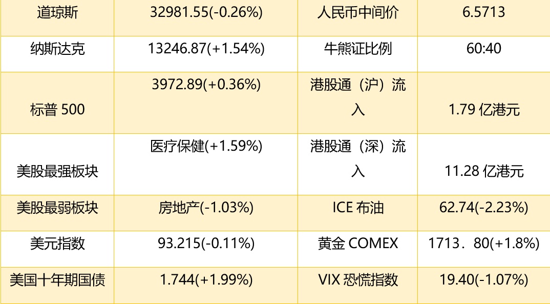 1、 美股收盘,道琼斯指数跌85.41点,跌幅0.26%,报32981.55点;标普500指数涨14.34点,涨幅0.36%,报3972.89点;纳斯达克综合指数涨201.48点,涨幅1.54%,报13246.87点。在3月份,道指、标普、纳指分别上涨6.6%、4.2%和0.4%;整个一季度内,道指、标普及纳指分别上涨7.8%、5.8%和2.8%。港股ADR指数上扬,按比例计算,收报28576点,涨197.94点或0.69%。