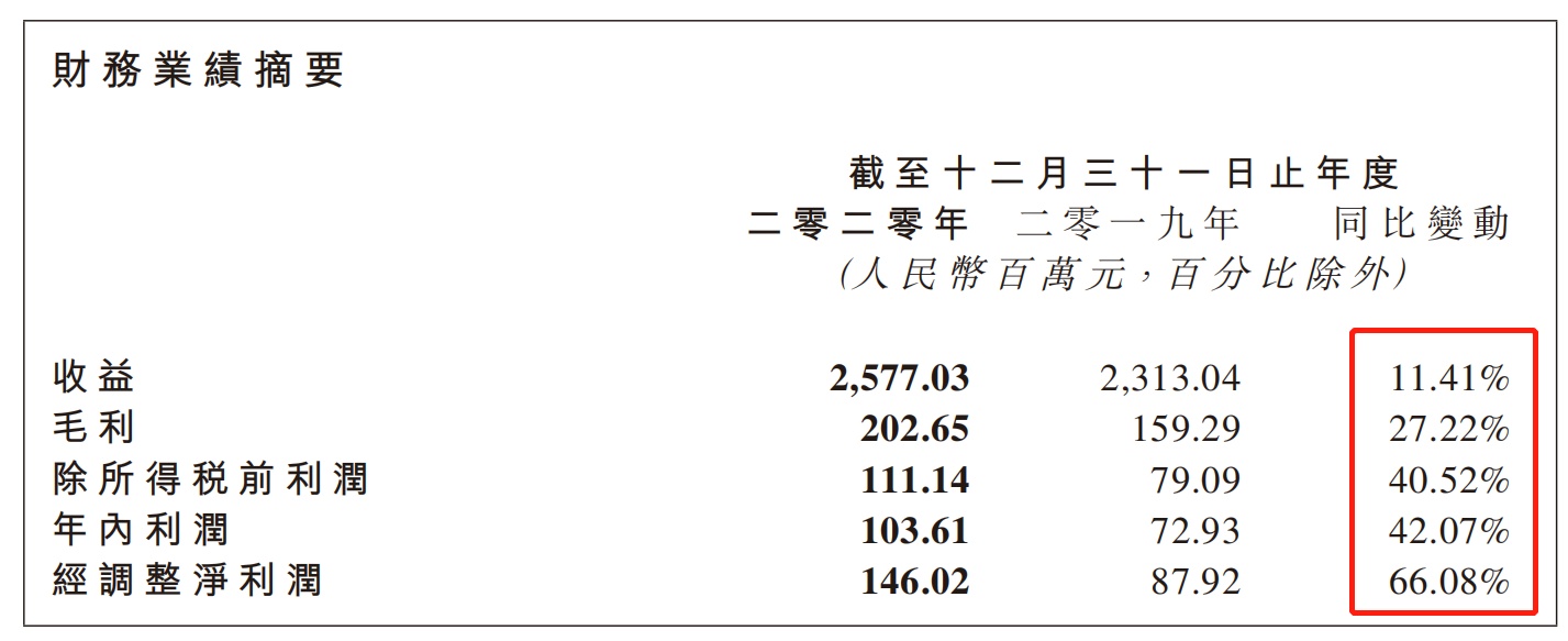 据财报数据显示,2020年,该公司实现总收入为25.77亿元,较2019年同期的23.13亿元增长11.41%;实现净利润为1.04亿元,同比增长42.07%,经调整后净利润则为1.46亿元,同比增长66.08%。