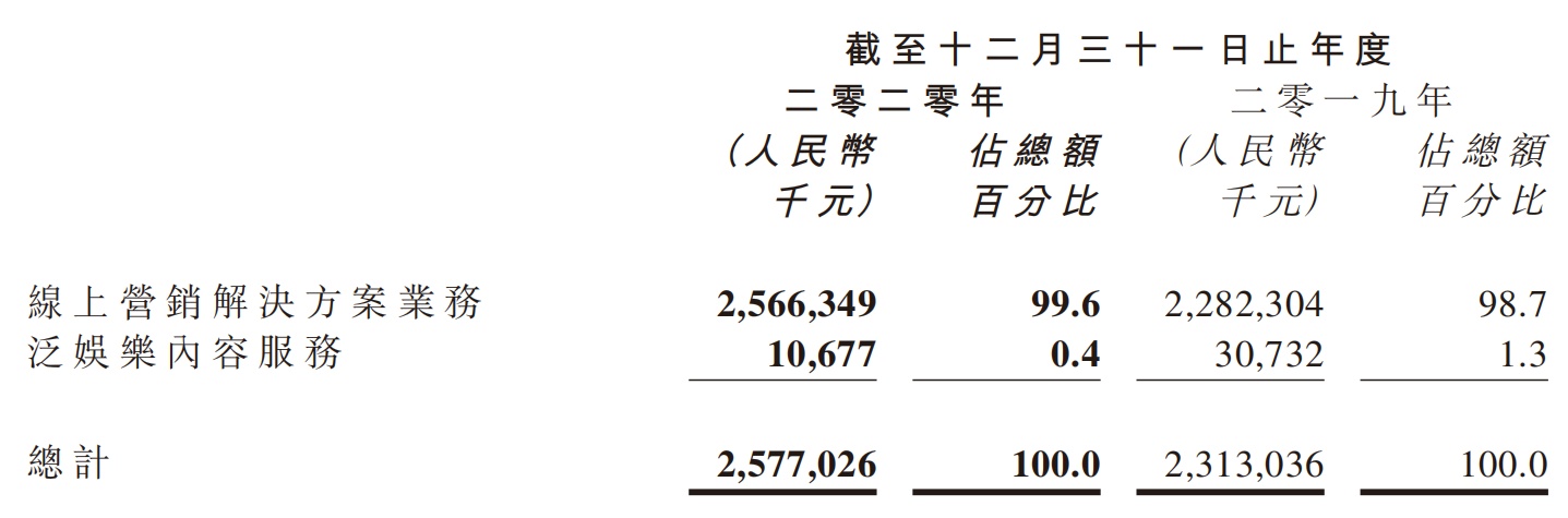 据云想科技财报披露,2020年,该公司录得总收入为25.77亿元,同比增长11.4%。在这其中,该公司的线上营销解决方案业务继续发挥“顶梁柱”作用——期内实现收益为25.66亿元,同比增长约12%。
