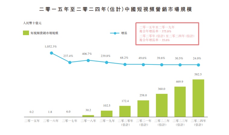 而高速增长的短视频行业,也为短视频营销行业开辟了一片蓝海——2019年,中国短视频营销市场规模达到1025亿元,并预期由2020年的1724亿元进一步增加至2024年的5825亿元,复合年增长率为35.6%。