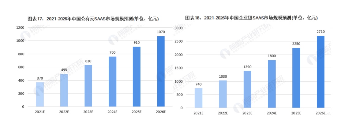 而需要指出的是,伴随着云计算技术的日益成熟,我国SAAS市场有望迎来跨越式发展——前瞻预测,2021年我国公有云SAAS市场规模将达到370亿元,企业级SAAS市场规模达740亿元,预计到2026年我国公有云SAAS市场规模将突破1000亿元,企业级SAAS市场规模将突破2700亿元。