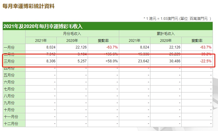 澳门3月幸运博彩毛收入83.06亿澳门元 同比增长58%