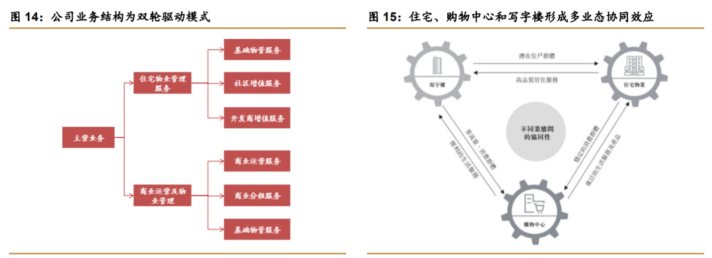 具体而言,其业务主要分为住宅物业服务和商业运营及物业管理服务两大板块。其中,住宅物管服务主要针对住宅及少量其他非商业物业(如体育馆、公园等),而商业运营及物管服务主要针对购物中心和写字楼。目前借助于大型商业综合体的资源及管理经验,华润万象生活已经打造出一个综合服务平台,形成住宅、购物中心和写字楼多业态协同效应。