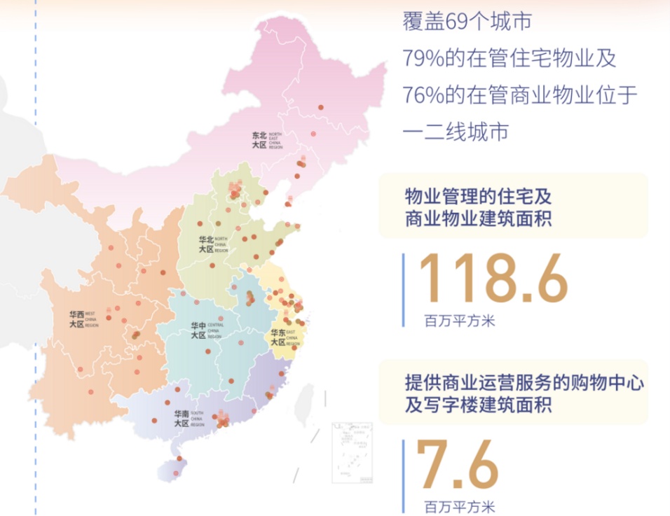 据最新财报数据,截至2020年末,华润万象生活业务拓展至69个城市,涵盖华北、华南、华西、华中、华东、东北这六个大区。在这其中,79%的在管住宅物业及76%的在管商业物业位于一二线城市。