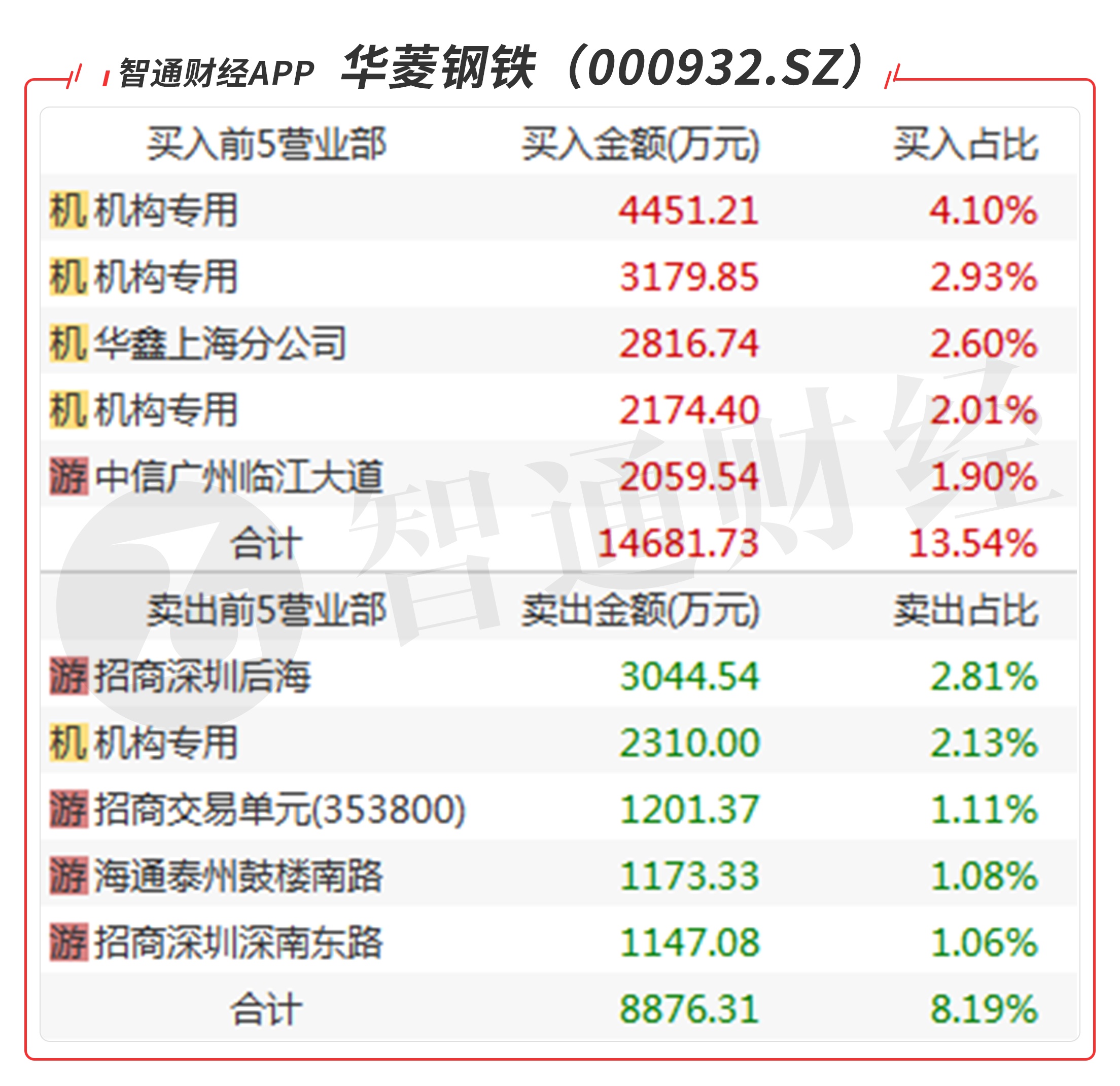 华菱钢铁(000932.SZ):多主力现身龙虎榜,三家机构共买入9805万元,一家机构卖出2310万元,买三是知名游资的席位买入2816万元,当日净买入7951万元,该股受益碳中和概念,近期调整充分,如持续放量,则有望突破前期高点8.56元。