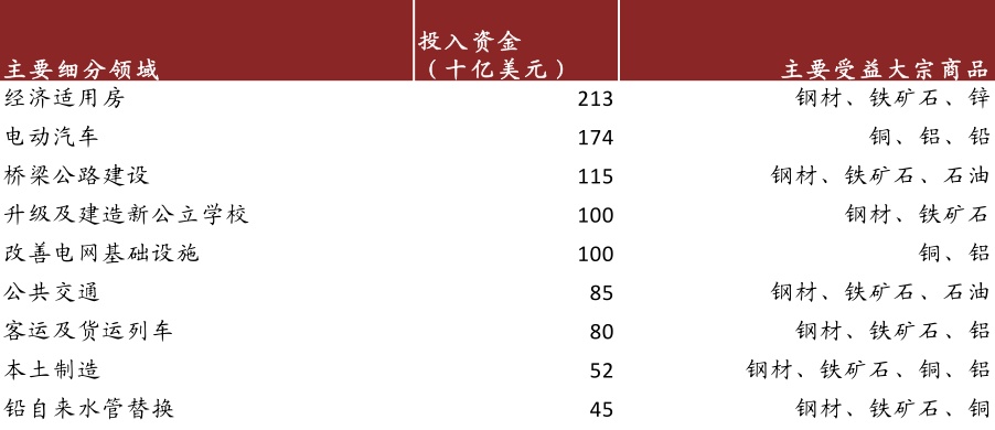 从细分领域看,经济适用房建设、电动汽车和桥梁公路建设是投入最多的三项,分别将投资2130亿美元、1740亿美元与1150亿美元。我们预计,钢材、铁矿石、铜、铝将是被惠及最多的大宗商品品种。其他对大宗商品会带来显著拉动的领域还包括改善电网基础设施(1000亿美元),公共交通(850亿美元)与铅制自来水管替换(450亿美元)。