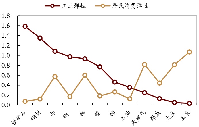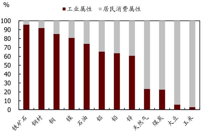 大宗商品中,工业属性的多寡决定了基建投资增强后的需求弹性