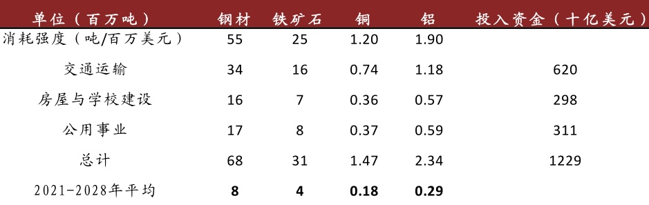 从自下而上看,我们着重测算了受拜登基建影响最大的四个大宗商品,钢材、铁矿石、铜与铝。通过比较历史投资额与消费量,我们为这四个工业属性最强的品种假设了单位美元投资消费强度。我们假设钢材、铁矿石、铜、铝的消费强度分别为55吨、25吨、1.2吨与1.9吨每百万美元强度,考虑拜登基建对大宗商品消费拉动最直接的三个领域,每年平均可以拉动钢材、铁矿石、铜与铝的消费约800万吨、400万吨、184千吨与292千吨。
