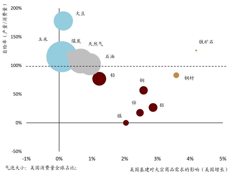重塑美国工业品供需平衡表,但从全球市场看,有色金属受益最明显。我们分别自上而下和自下而上地估算美国基建投资对大宗商品的影响,美国工业品的供需平衡表可能因此重塑。从过去看,美国工业品需求在全球占比较低,但自给率也低,因此,基建活动增强可能增加美国对外部工业品的进口需求。其中,全球铜铝市场可能因此而进一步趋紧,而黑色金属则自给率相对较高,且美国供需对全球供需平衡的影响相对较小。此外,和疫情前产量水平相比,当前美国石油供应仍有将近23%的增产空间,基建活动会推动石油消费,可能有助于缓解美国局部市场的过剩,但对石油进口影响有限。从全球供需平衡表来看,美国基建投资增强,对大宗商品价格的边际影响排序为:有色金属>能源>黑色金属>农产品。