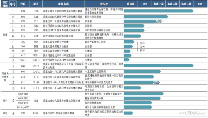 公司各重磅靶点在研产品临床试验均在有序推进。例如,抗IL-1β人源化单克隆抗体613已完成临床申报资料撰写;双特异性抗体705、706均已完成中试生产。