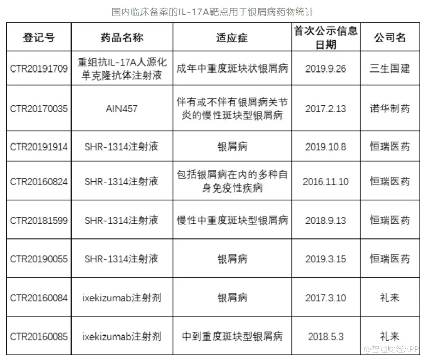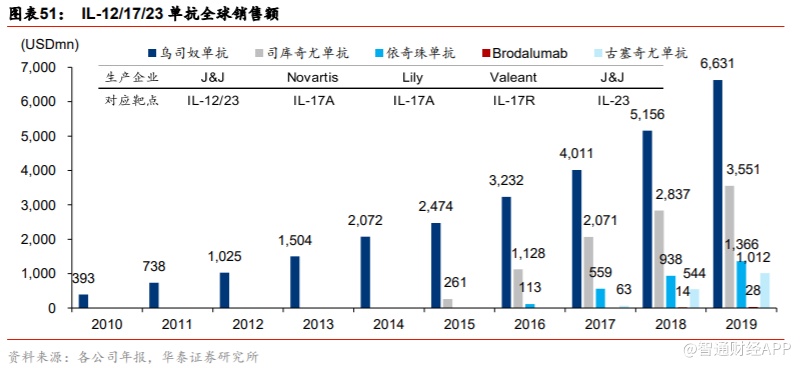 智通财经APP了解到,目前,全球有2款针对 IL-17A 靶点的药物上市,但其药物市场规模已达到 50 亿美元左右。其中,诺华Cosentyx(司库奇尤单抗,secukinumab)于2015年1月21日获批,是全球首个上市的anti-IL-17A单抗,目前主要获批用于治疗斑块状银屑病,银屑病关节炎、强直性脊柱炎,2019年销售额达到35.51亿美元,已成是诺华当前年销售额最高的产品。