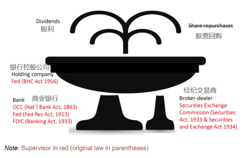 然而这一项政策举措却有两个版本,涉及三个机构。在我们理解一、二之前,先得明白这个三。一家大型美国银行是一个复杂得让人头皮发麻的组织,但若将很多细节抽象化,它其实是:1)受货币监理署(OCC)、美联储或联邦存款保险公司(FDIC)监管的商业银行;2)受美联储监管的上市银行控股公司(BHC);3)受证券交易委员会(SEC)监管的经纪交易商。