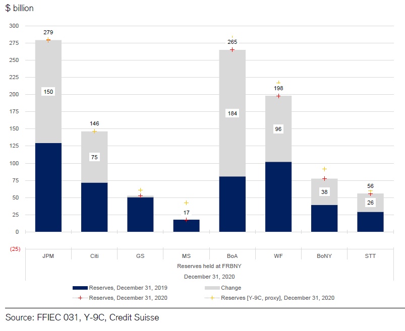 尽管各大银行没有选择签约豁免,但2020年的信贷发展趋势还是顺应了美联储的意图。企业银行贷款增加了930亿美元(9%);未偿企业债券增加了7420亿美元(12.8%)。消费信贷没有增长,因为刺激计划的支票偿还了信用卡债务。抵押贷款债务增加了4540亿美元(4.3%)。大型经纪交易商增持了530亿美元国债(17%)。尽管疫情迁延日久,信贷还是流向了企业和家庭,交易商做市能力也有所提高。