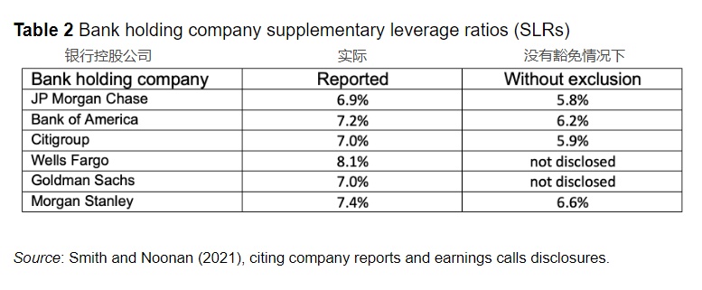 监管机构的附加条件,限制了银行所能享受到的放松程度。如表1所示,以最大的BHC摩根大通为例,其商业银行比附属的经纪交易商规模大得多,持有的准备金和美债也多得多。摩根大通潜在可释放的资本金为320亿美元,即6490亿美元乘以5%的最低杠杆率,但该行的管理层决定仅释放50亿美元。