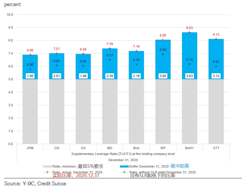 从4月1日开始,在测试银行股东权益(准确说是一级资本)是否足以支撑其总资产时,财政部发行的证券和银行准备金将不再被排除在总资产之外。这种测试被称为补充杠杆要求(SLR),它规定每20美元的资产至少对应1美元的股东权益(即最低5%的资本充足率)。