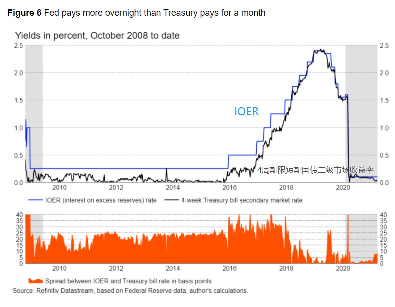 此外,这种用短期国债取代准备金的做法还可能降低联邦融资的总成本。尽管短期国债期限相对较长,但收益率往往低于美联储的IOER(图6)。这意味着,合并后的政府部门将以更低的成本为自己融资,而不是两种不同的债务融资,一种是财政部的债务,另一种是美联储的债务。