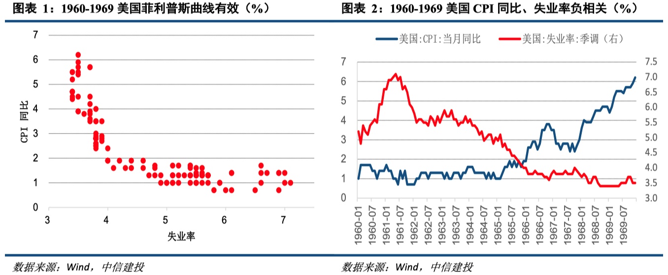 菲利普斯曲线的提出。新西兰经济学家菲利普斯于20世纪50年代提出菲利普斯曲线,主要通过统计英国1861-1957年近100年的货币工资的变动率与失业率资料,得到二者存在此消彼长的关系的结论。由于工资和物价上涨关系紧密,此后的经济学家将菲利普斯曲线转换成通胀率与失业率之间的关系。菲利普斯曲线之所以广为流传,是因为其有明确的政策含义,即通胀率和失业率此消彼长,要想保持较低的失业率,就得忍受较高的通胀率,二者不可兼得。