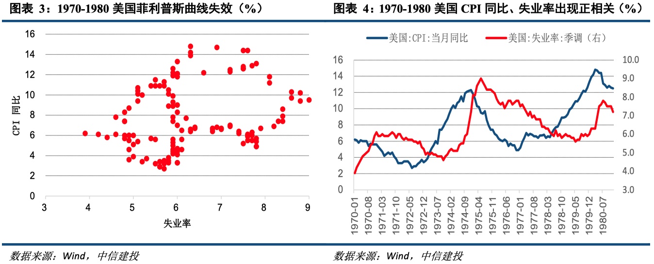 菲利普斯曲线的失效与滞胀的提出。以美国为例,60年代菲利普斯曲线近乎完美的捕捉了其通胀率和失业率之间的关系。而进入70年代,美国以及大多数西方国家出现了高通胀率与高失业率伴随的现象,菲利普斯曲线效应消失,这种状态被称为滞胀。美国滞胀最典型的时期就是1973-1975年、1979-1980年两个时期。
