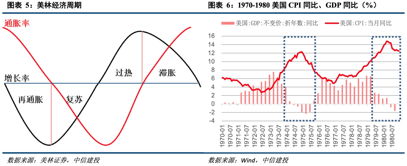 滞胀除了用于描述菲利普斯曲线失效(高通胀伴随高失业率)的局面,还有一个经典的用法是2004年美林证券提出的对一种经济周期的刻画。美林证券根据产出缺口和通胀率将经济周期划分为四类:再通胀(Reflation)、复苏(Recovery)、过热(Overheat,)、滞胀(Stagflation)。在滞胀周期中,经济增长逐步放缓,但通胀率持续走升。实际上在一般情况下,经济增长放缓同时将带来失业率的上升,因此美林周期中对滞胀的描述本质上和菲利普斯曲线失效后的经济表现是一样的,只是一个是对高通胀、高失业率现象的描述,另一个是从经济运行周期角度用滞胀来对一种经济周期进行定义。美林经济周期中美国最典型的滞胀周期也是1973-1975年、1979-1980年两个时期。
