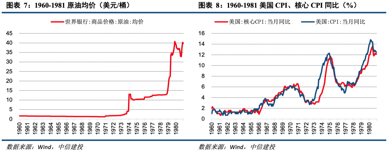 滞胀更为重要的原因当是石油危机引起的外部冲击。因为美国滞胀特征最为明显的时期就是石油危机期间。此外,不仅美国,七国集团(G7)均在同一时期发生滞胀,因此滞胀的最主要原因或许不应只是哪一国的内部因素,而是各国集体面临的外部冲击。1973年10月的第四次中东战争爆发后OPEC宣布石油禁运,1979年伊朗伊斯兰革命爆发引发了第二次石油危机后原油日产量锐减,导致这两个时期原油价格飙升,发达国家经济增长和物价均收到严重冲击,物价层面不仅能源价格大幅上涨,剔除能源和食品后的核心CPI亦同步大幅上涨。