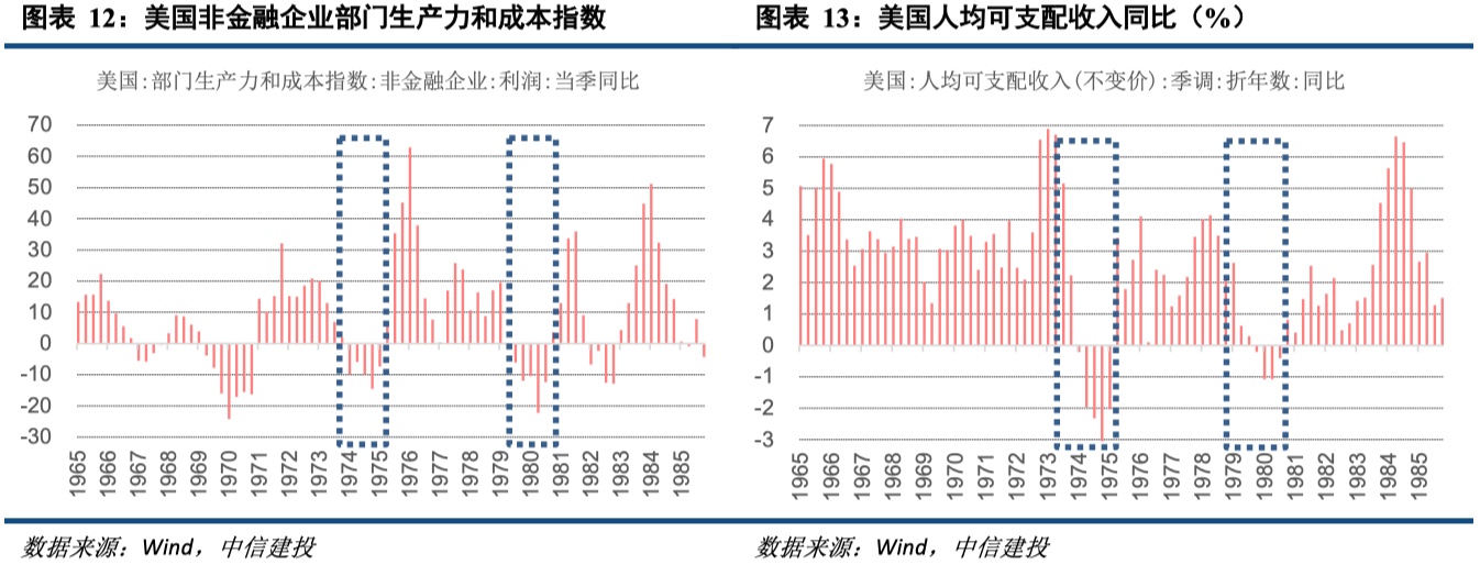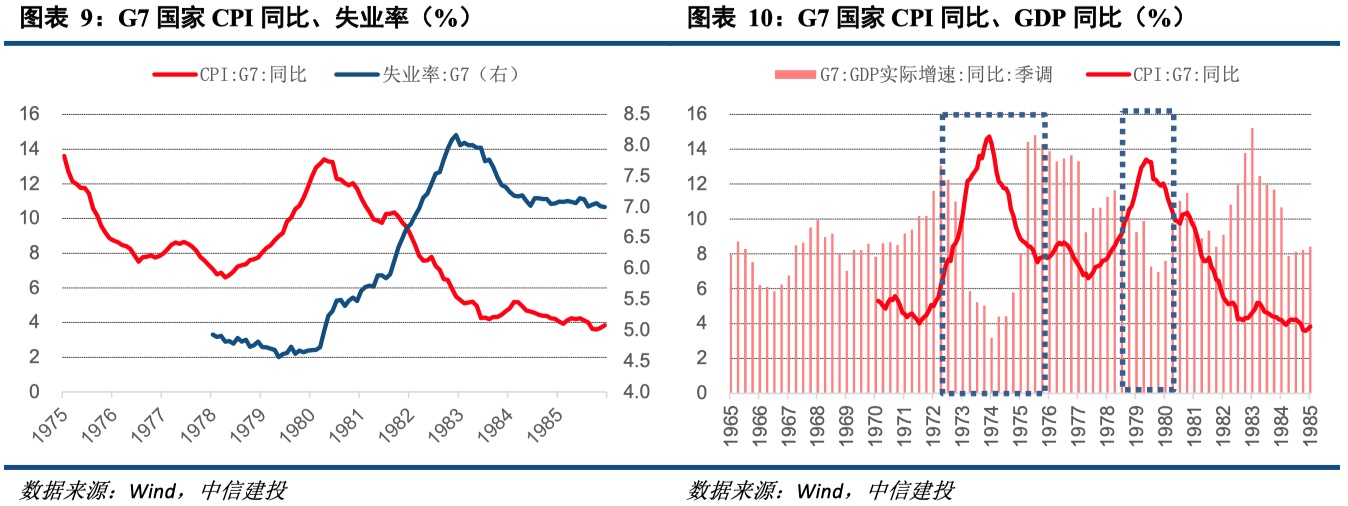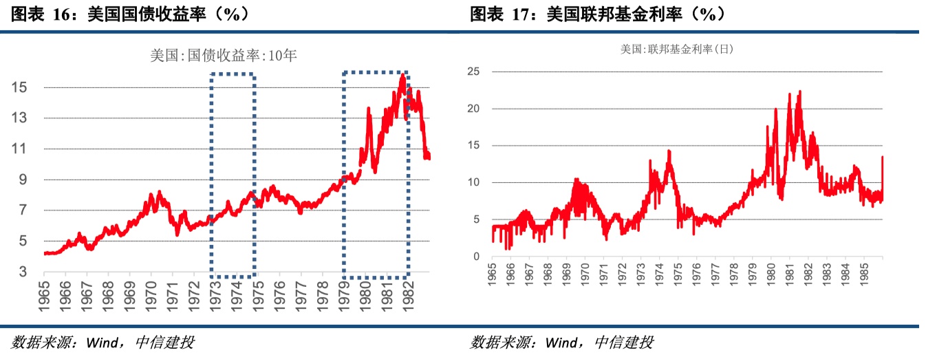 需要说明的是,第一次滞胀时期,美联储主席伯恩斯对实现控制通胀还是促进经济增长的目标犹疑不定,因此在未完全走出滞胀局面的情况下又放松货币政策,从而导致通胀又持续飙升,后被称为“走走停停”的货币政策。但第二次滞胀时期,美联储已吸取教训,主席保罗·沃尔克结束了美联储的“走走停停”政策,大幅提高利率直至通胀率明显得到控制,后被称为沃克尔紧缩。因此,若滞胀再次袭来,央行或许更多参考第二次对滞胀的治理经验,即对通胀的治理更为关注,而牺牲经济增长的目标。