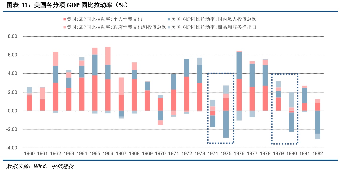 尽管各国经济放缓、物价走升有其各自内生性原因,但因为七国集团(G7)均在石油危机期间发生严重滞胀,因此当时滞胀的最主要原因还是石油危机这一外部冲击。滞胀的经济影响,主要表现为私人消费和私人投资的大幅下滑。因为在石油价格飙升的带动下,原材料、消费品价格普遍大幅上涨,居民消费能力下滑,企业成本走高而销量回落,缩减生产,加大裁员,最终形成负向反馈。而滞胀的对政策和市场影响,表现为货币政策收紧,大宗商品价格普遍上涨,股债面临双杀。