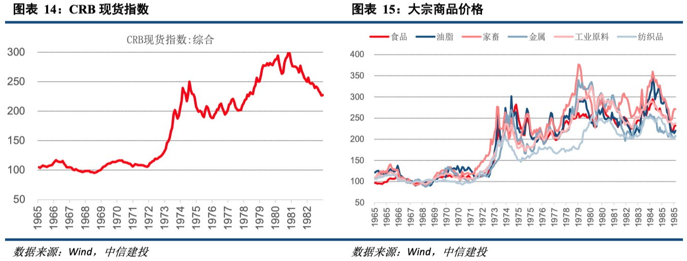 滞胀的对政策和市场影响,表现为货币政策收紧,大宗商品价格普遍上涨,而股债面临双杀。历史上由石油危机引发的滞胀时期中,不仅是石油价格大幅飙升,几乎各类大宗商品价格均大幅走升。而由于经济增长的下行,企业利润的下滑,货币政策的收紧,股市和债市均面临不利局面。