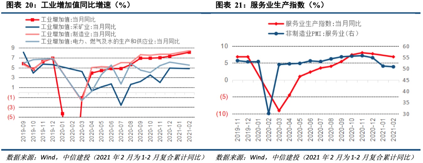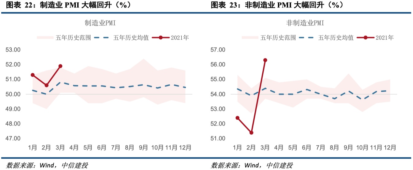工业生产保持强劲。1-2月工业增加值同比增长35.1%,剔除基数效应即两年复合增速为8.1%(前值即2020年12月当月增长7.3%),1、2月工业增加值环比季调增长0.66%、0.69%,相比12月加快,同比、环比数据均体现工业增长进一步走强。3月制造业PMI回升且高于过去五年同期水平,除春节后季节性恢复外,出口高增长和内需回暖带动整个生产和需求快持续修复,也是推高3月制造业PMI的重要因素。