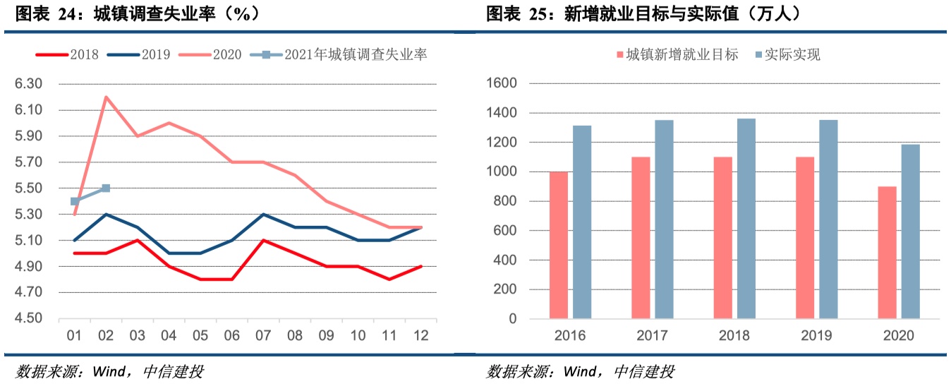 1-2月城镇新增就业148万人,比2020年同期多40万人,比2019年同期少26万人。1、2月全国城镇调查失业率为5.4%、5.5%,相比2020年末的5.2%上行0.2、0.3个百分点。1-2月失业率比上年末上行月有季节性效应因素,如2019年1、2月失业率也上行0.2、0.4个百分点,此后转向回落,因此未来几个月失业率大概率也转向回落。但当前失业率总体水平仍高于2018、2019年,1月疫情对就业市场也有负面影响,2021年稳就业仍将是全年重点工作之一,两会上政府工作报告增加就业有关内容的篇幅,城镇新增就业目标定为1100万人以上,城镇调查失业率目标定为5.5%左右,回到往年目标水平,根据往年经验,最终的就业数据要远好于政府年初目标,因此目标仅仅是底线,全年失业率大概率相比年初明显回落。