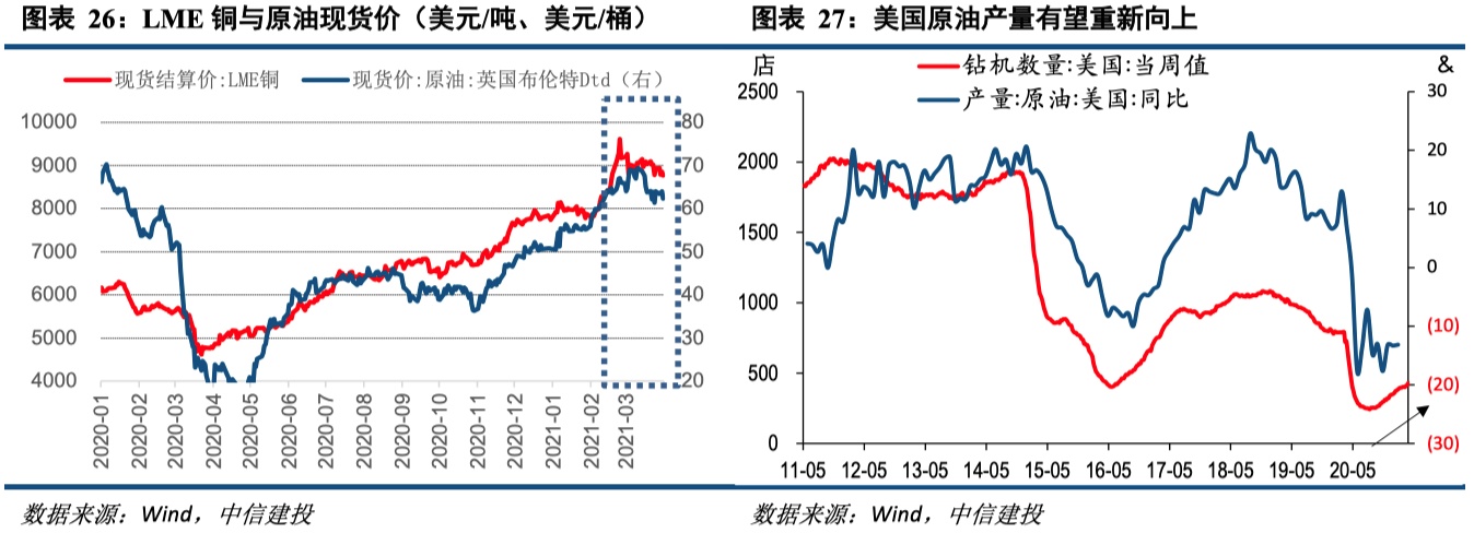 2020年12月至2021年3月是工业品快速上涨阶段,3月中下旬以来原油、铜价已开始高位调整,欧佩克4月会议也表示开始增产,整体看未来工业品价格持续上涨的概率较低,我国PPI同比也将在二季度触顶后回落。
