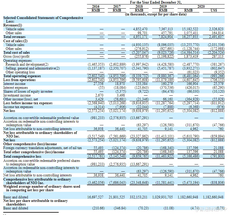 财报显示,蔚来2020年营收为162.58亿元,同比增长107.8%;毛利润为18.73亿元,上年同期总亏损11.99亿元;毛利率为11.5%,上年同期为负15.3%。净亏损53.04亿元,同比缩窄53%;归属于公司普通股股东净亏损56.11亿元,同比缩窄50.8%。摊薄后每股亏损4.74元,同比缩窄42.8%。