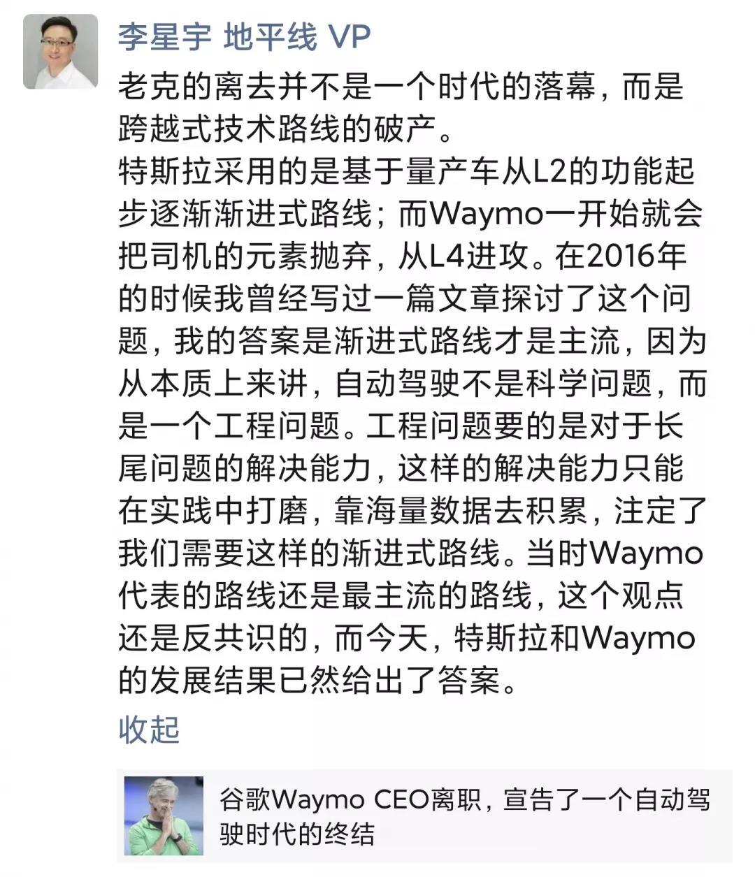 想想今年一月,John Krafik谈及了延续多年的自动驾驶路线之争,还矛头直指特斯拉,放言“特斯拉还算不上Waymo的竞争对手,因为特斯拉做的是辅助驾驶系统,而非自动驾驶系统。”马斯克发推回应:“令人惊讶,特斯拉的AI硬件和软件比Waymo的都要好。”但短短几个月后,就宣告离职,想来也令人唏嘘。