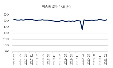 国内工业企业前2个月盈利录得较好增长,3月PMI数据向好。2021年前2个月规模以上工业企业营收、利润分别同比增长45.5%、178.9%,较2019年前两个月复合增长6.82%、25.44%,分行业来看,计算机、通信和其他电子设备制造业、汽车制造业、电气机械和器材制造业、专用设备制造业等行业利润总额略录得较好的增长,制造业盈利复苏态势良好,一季报业绩超预期个股落在相应板块概率较大。此外,3月制造业PMI录得51.9%,较2月提升1.3%,春节过后景气度上行,其中,PMI生产和新订单分项分别为53.9%和53.6%,较上个月分别上行2.0%和2.1%,生产和需求同步回升,整体数据反应经济景气向好。