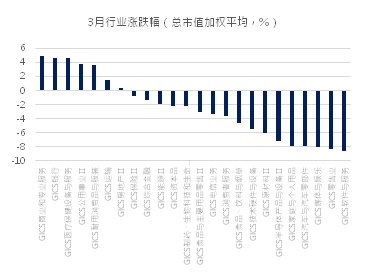 多个压制因素短期难消解,料后市延续震荡筑底态势。10年期美债收益率始终徘徊在1.7%左右,显示企稳态势,市场已逐步计价美债影响,但仍偏谨慎;此外,通胀风险使得多个新兴市场央行开始加息,且国际政治局势频繁扰动,上述因素叠加拖累市场情绪,港市受到压制,恒指自3月起至今回落约2.6%。分行业来看,3月软件与服务、零售、媒体与娱乐、汽车及汽车零部件、家庭及个人用品等行业板块跌幅居前,分别录得8.62%、8.29%、7.98%、7.96%、7.84%的跌幅;商业和专业服务、银行、医疗保健设备及服务、公用事业、耐用消费品、运输、地产、保险较为抗跌,分别录得4.95%、4.62%、4.60%、3.70%、3.66%、1.43%、0.32%、-0.89%的涨跌幅,整体而言价值较成长更为抗跌。