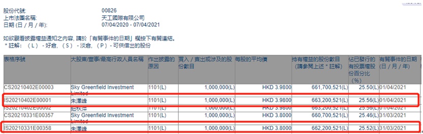 根据香港联交所最新资料显示,3月31日,朱泽峰增持天工国际100万股,每股作价3.80港元,总金额为380万港元;4月1日,朱泽峰继续增持公司100万股,每股作价3.98港元,总金额为398万港元。