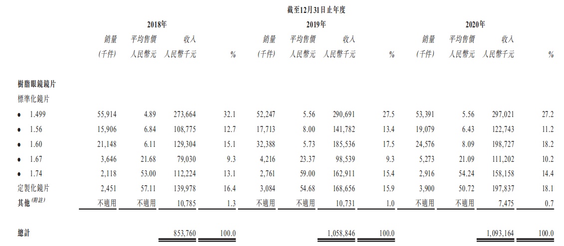 招股书披露,截至2020年,标准化镜片中,1.499折射率的树脂眼镜镜片的平均售价仅5.56元,1.56、1.60、1.67、1.74折射率的树脂眼镜镜片的平均售价则分别为6.43元,8.09元、21.09元、54.24元;定制化镜片的平均售价则为50.72元。