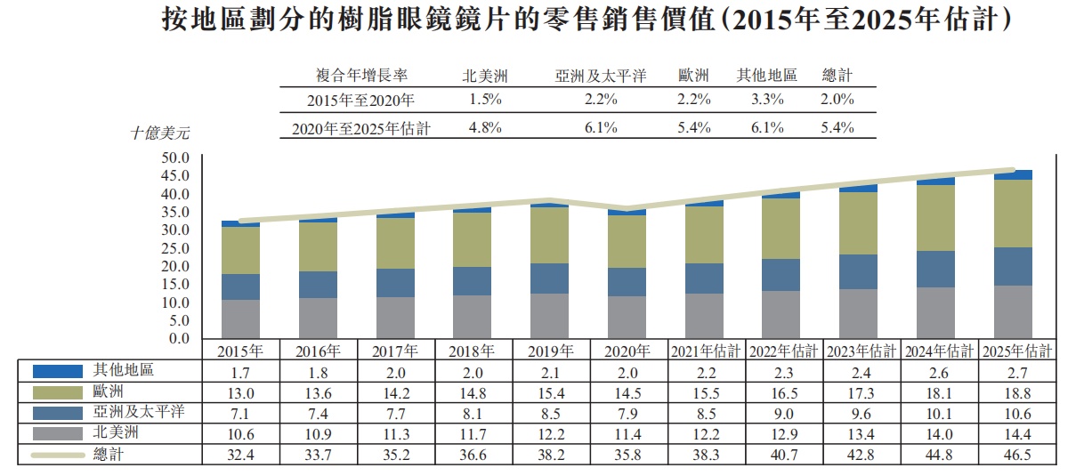 据招股书显示,树脂眼镜镜片广泛用于眼镜镜片及太阳眼镜镜片。全球树脂眼镜镜片的零售销售价值 总额由2015年的324亿美元(约2119亿人民币)增加至2020年的358亿美元(约2341亿人民币),复合年增长率为2.3%。预期市场规模将于2020年至2025年增至465亿美元(约3041亿人民币),复合年增长率为5.4%。